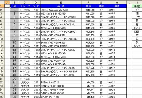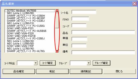 赤丸の部分をマウスでクリックすると、マスタに登録してあるデータがすべて見ることが出来ます
