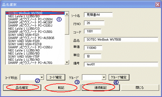 @品名を選択 A品名確定ボタンを押す C連続転記ボタンを押す 続いて@の品名を再選択で繰り返し